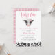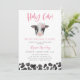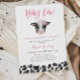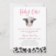 Carte d'invitation baby shower à thème de ferme mignonne avec l'aquarelle d'une petite vache avec une fleur dans la tête. Le texte dit "vache sainte ! nous avons un bébé !"