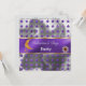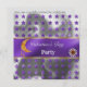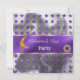 Une élégante invitation violette et argentée à paillettes avec une lune orange, un charme de perle de cornaline dorée, des colliers de cœurs orange cornaline dorés et des étoiles violettes brillantes.
