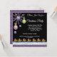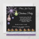 Une élégante invitation combinant les éléments de la neige, de la glace et de l'argent/améthyste. La carte de Noël est décorée de boules de Noël rose et or clair, vert clair et or. Il y a un flocon de neige améthyste géant sur la gauche. Un broche avec diamants et perles violets est au centre du broche. Il y a deux boules de neige améthystes brillantes en dessous. Sous le texte, il y a le Père Noël sympathique sur un traîneau glissant sur un lac glacé, de la neige et de la feuille violette. L'arrière - plan est noir pour représenter la nuit. Le texte est écrit en blanc.