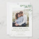 Carte double face "save the date" élégante pour mariage avec eucalyptus en aquarelle. Avec feuillage d'eucalyptus peint à l'aquarelle. Ce modèle de conception présente une mise en page avec une photo.