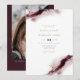 Ce faire-part de mariage présente des éclaboussures d'aquarelle bordeaux bohème, une police dorée pointue et un design minimaliste élégant. C'est l'invitation parfaite pour un merlot d'hiver ou d'automne et mariage d'or. Modifiez facilement la plupart du texte et la photo à l'arrière pour votre touche personnelle.