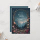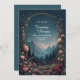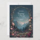 Invite your guests to a celebration of love amidst nature's grandeur with this breathtaking design. The artwork features a delicate, antique copper-tone archway entwined with lush climbing blooms in shades of magenta and blush, creating a romantic window to the wild. Through this floral gateway, a majestic vista unfolds, revealing jagged snow-capped peaks, a dense evergreen forest, and a wildflower-filled meadow under a twilight sky. The composition perfectly balances the intimacy of a garden with the awe-inspiring beauty of an alpine landscape. This enchanting illustration is a flawless choice for a destination wedding in the rockies, a rustic lakeside ceremony, or an outdoor spring celebration. You might also select this scenic aesthetic for a twilight engagement party, a sophisticated sweet sixteen with a fantasy theme, or a milestone anniversary dinner. This picturesque landscape border is also perfectly suitable for boutique travel agency posters, wilderness glamping retreat brochures, or fantasy book launch events.