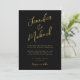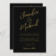 Cette coutume moderne tout en une invitation de mariage comprend un script de calligraphie en faux or écrit à la main sur un simple arrière - plan noir. Personnalisez avec vos noms et votre date de mariage, ainsi que tous vos détails de mariage sur l'avant et l'arrière de la carte. Meilleurs voeux pour votre mariage et mariage ! Conçu par Susan Coffey.