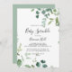 Ce script de calligraphie vert feuillage bébé sprinkle invitation est parfait pour un baby shower moderne. Le design se compose d'aquarelle dessinée à la main d'élégantes branches d'eucalyptus botaniques et de feuilles, disposés en de beaux bouquets et motifs géométriques.