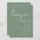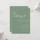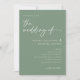 Ce faire-part de mariage moderne est doté d'un arrière - plan vert sage frais et d'une calligraphie élégante et manuscrite blanche. Le contraste de couleurs tendance et la disposition épurée et minimaliste lui confèrent une atmosphère chic et contemporaine. Un choix parfait pour les couples qui veulent un design frais et tendance qui se démarque tout en gardant les détails simples et élégants.