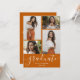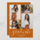Ajoutez vos quatre photos préférées à l'avant de ces invitations à la fête de remise des diplômes avec le mot "gradué", le nom de votre diplômé et l'année de classe en lettres chic sur un arrière - plan couleur orange brûlé. Les détails de votre fête sont au verso. PLUS de dessins et de couleurs réalisés dans notre magasin, y compris les annonces, enregistrer les cartes de date et les cartes postales.