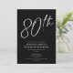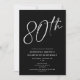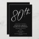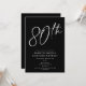 Cet invitation moderne de fête du 80e anniversaire dispose d'un arrière - plan noir chic avec un script blanc et une typographie moderne. Le script dit "80ème". Toutes les couleurs (même le script année) sont entièrement et facilement personnalisables. Vous pouvez même ajouter une photo à l'arrière ! Il suffit d'utiliser "outil de conception" dans le menu déroulant de personnalisation.