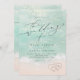 Magnifique turquoise abstraite aquarelle étincelante vague d'océan et les coeurs dans l'arrière - plan de plage de sable, surmonté d'un script élégant et d'élégante police serif, détails mariages et le code QR du site Web sur le dos, moderne et simple. Grand faire-part de mariage pour le mariage nautique de plage, mariage de destination tropicale, mariage sur le thème de l'océan côtier en été.