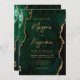 Cette élégante invitation de mariage présente une image arrière - plan d'agate d'aquarelle vert émeraude parée de parties scintillant en faux or. Le texte personnalisable combine écriture manuscrite moderne couleur or, cuivre et polices italiques. L'envers offre de l'espace pour les détails mariages sur un arrière - plan de course vert correspondant, ainsi qu'un code QR que les clients peuvent scanner pour visiter votre site Web et RSVP, ce qui permet d'économiser le coût d'impression et d'envoi de cartes RSVP séparées.