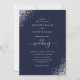 Elégante invitation à mariage bleu marine et argent avec parties scintillant argent sur un arrière - plan bleu marine. Invitations de mariage chic avec script moderne parfait pour un élégant et luxueux mariage bleu marine et argent.