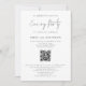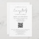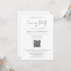 Script moderne QR Code Mariage Soirée de soirée. Disponible numériquement et imprimé. Ajoutez votre code QR à votre site Web mariage afin que vos invités puissent RSVP et voir tous les détails en ligne sans avoir besoin de pièces jointes séparées. Une typographie informelle en noir pour Sovening Party complétant le reste du texte que vous pouvez facilement personnaliser.