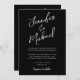 Cette coutume moderne tout en une invitation de mariage comporte un script de calligraphie blanc écrit à la main sur un arrière - plan noir. Personnalisez avec vos noms et votre date de mariage, ainsi que tous vos détails de mariage sur l'avant et l'arrière de la carte. Meilleurs voeux pour votre mariage et mariage ! Conçu par Susan Coffey.