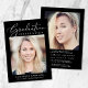Faire-part de graduation noire d'une fille élégante et invitation à la grande fête avec "Graduation Celebration" en écriture et typographie blanche moderne, sa photo et son nom, l'école et l'année de classe en simple typographie blanche. Au verso, ajoutez une autre photo et les détails de la fête de remise des diplômes.
