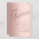 Une invitation Sweet 16 moderne. arrière - plan en or rose et le mot Seize écrit avec de grandes lettres. Personnalisez et ajoutez un nom et des détails du parti.