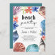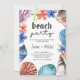 Invitation de la Beach Party fiançailles, encadrée de coquillages aquarelle et de fleurs tropicales. "beach party" est écrit à la main et le texte restant est entièrement modifiable.