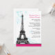 Cartes d'invitation : Élégantes et modernes invitations de réception de mariage parisien avec une tour Eiffel en nuances de gris sur un fond rose fuchsia avec des fioritures bleu aqua derrière.