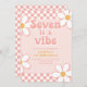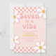 Sept est une ambiance Fille Groovy Invitation d'anniversaire 7ème rétro inspiré avec des polices de style 70's et des marguerites et un motif à carreaux.