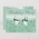 Elégantes invitations personnalisées à la menthe verte anniversaire pour les femmes et les adolescentes avec un beau motif de parties scintillant à paillettes à la menthe verte pétillante, un joli joli arc et ruban imprimé vert menthe et joli bijou en diamant imprimé. Ces élégants invitations glamour sont décorés des deux côtés. Belles invitations chic, chic, tendance, modernes.Veuillez noter : Tous les invitations de Zazzle ont des images imprimées à plat. Le texte, la police et la couleur de la police peuvent tous être customisés. Si vous avez besoin d'aide pour customiser votre produit, veuillez me contacter par l'intermédiaire de mon magasin. Je serai heureux d'aider.
