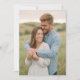 This wedding invitation features a tender moment between a couple embracing in an outdoor setting, capturing the essence of love and unity. The design showcases a soft color palette with earthy greens from the grassy fields and muted blues from the sky, complemented by the delicate pastel floral pattern on the woman's dress. The photographic style creates a realistic yet dreamy atmosphere, emphasizing the rustic and natural theme. The composition focuses on the emotional connection between the two figures, set against a serene backdrop that evokes joy and tranquility, making it perfect for couples seeking an intimate and heartfelt celebration.