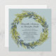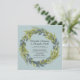 Cette belle faire-part de mariage dispose d'une couronne de verdure luxuriante en vert citron et turquoise foncé. L'arrière - plan est une couleur turquoise claire et poussiéreuse.