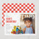 Celebrate turning two with this Sesame Street–inspired birthday design featuring a bold red checkerboard background and colorful confetti sprinkled throughout. The vibrant red and white pattern creates an energetic, eye-catching party vibe, while playful sprinkles add movement and excitement across the layout.