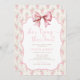 Shabby Chic She's Tying the Knot Bridal Shower Invitation. Belle arbalète rose élégante avec cadre à coquilles Saint-Jacques et joli arrière - plan de papier peint rose. Doux comme la mariée à être. Accent du coeur écriture scénarisée dans une teinte rose douce et romantique.