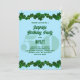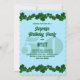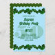 Modèle d'invitation à la fête d'anniversaire selon la coutume shamrock verte 50e (ou tout autre âge jalon). Des trèfles vert foncé forment des bordures en haut et en bas sur des cartes bleu pâle avec du texte vert. L'âge est affiché en grand nombre comme toile de fond pour le texte de l'invitation. Reverse est vert foncé solide.