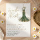 Celebrate the bride-to-be with this elegant and unique bridal shower invitation. Featuring a stunning watercolor emerald green gown with intricate gold embroidery detail, this design is suspended from a gold hanger and surrounded by a whimsical bed of white daisies.