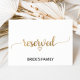 Ce simple mariage de calligraphie dorée "réservé" est parfait pour un mariage chic. Le design est recto verso (tirages sur les deux côtés) et présente une typographie de feuille d'or et un coeur doré. Utilisez ces cartes pour réserver des chaises ou des tables à la cérémonie de mariage ou à la réception. Remarque : Ce design ne comporte pas de véritable feuille d'or. C'est un graphisme de haute qualité fait pour ressembler à du papier doré.