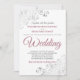 Ce faire-part de mariage présente un design simple mais élégant avec des rose ou mauves poussiéreux et des lettres de script grises sur un arrière - plan blanc. La simplicité de la conception est compensée par les fraises en fausse feuille argent dans les coins. Le flegree est orné et floral et offre un contraste agréable avec le texte sobre. Le libellé est formel et traditionnel, mais l'agencement chic le rend moderne et accessible.