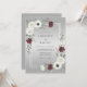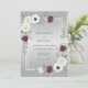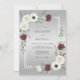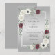This design features a sophisticated gradient background in shades of silver and dove gray. Elegant white anemones and deep burgundy blossoms create a striking contrast against muted green eucalyptus foliage. It offers a refined and moody aesthetic perfect for an upscale winter or late autumn event.