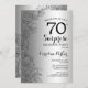 Invitation à la fête d'anniversaire de la Surprise Argent 70th. Design féminin de glam avec fausse feuille d'argent, accents botaniques et police de script de typographie. Carte invitation florale simple parfaite pour une célébration anniversaire surprise femme élégante. Peut être customisé à n'importe quel âge. Invitations Zazzle imprimées ou téléchargement instantané modèle imprimable numérique.