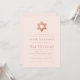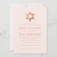 Une simple invitation de bat-mitzvah rose et or rose dont la seule décoration est l'étoile de David (fausse) or rose dans la partie supérieure (et au dos). Le fond est rose saumon. Tout le texte est en majuscules rose foncé et peut être modifié.