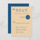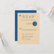 Elégante carte de réponse mariage moderne avec deux petits coeurs bleus, formes géométriques rectangulaires et un cercle avec la date de réponse demandée à l'intérieur sur un arrière - plan de pêche beige clair. ++++++++++++++++++++++ La carte est adaptée aux mariages modernes et branchés en intérieur toutes saisons. Principalement recommandé pour les réceptions chics officielles.