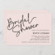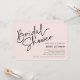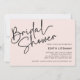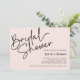 Invitations minimalistes de douches nuptiales avec "Fête des mariées" en haut à gauche, présentées dans un script de calligraphie noir contre un arrière - plan rose vif. Customisez les invitations à la douche nuptiale rose avec le nom de la future mariée et les détails de la fête de la douche ci-dessous. L'invitation de douche nuptiale contemporain peut être retourné pour révéler un arrière - plan rose solide