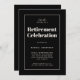 Simple, moderne et élégant, cette invitation du Parti de la retraite a un attrait sophistiqué. Un arrière - plan noir au texte beige en ivoire clair encadré d'une fine bordure assortie transmettent les détails de votre événement avec un style contemporain. Le modèle de texte moderne est facile à personnaliser avec vos détails d'événement. Cette invitation est un choix parfait pour célébrer la retraite de n'importe quel genre. Cette invitation peut être commandée sous forme d'invitations imprimées ou de téléchargement numérique sans papier, ou les deux !