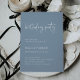 Ces invitations de fête d'anniversaire bleu poussiéreux et élégantes sont simples et minimalistes mais très élégantes grâce à l'écriture manuscrite blanche moderne et la disposition propre.