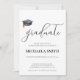 Invitation de graduation simple et moderne avec une illustration d'une casquette noire de graduation et d'une typographie élégante. Illustré et dessiné par Patricia Alvarez.