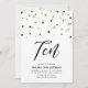 Célébrez votre jour spécial avec cette invitation simple et minimaliste pour un anniversaire de 10 ans. Ce design présente une écriture stylée avec des confettis en forme d'hexagone dans une combinaison de couleurs noir et or. Plus de designs disponibles dans ma boutique BaraBomDesign.