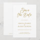 Design moderne minimaliste et fantaisiste, fond blanc, calligraphie script doré personnalisable, design élégant de save-the-date de mariage. Le fond blanc avec typographie dorée personnalisable évoque une sensation d'élégance classique.