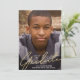 Cette carte de graduation simple et moderne présente une superposition de script de feuille d'or et une photo complète. Sur le devant, "Graduate" est affiché en bas en écriture manuscrite sur une grande photo verticale. Ajoutez le nom et la photo de votre diplômé, l'année de remise des diplômes et l'école au premier plan. Au verso, vous pouvez ajouter les détails de la fête de remise de diplômes.