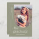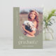 Ce carte photo moderne de remise de diplômes est doté d'une typographie élégante et d'un cadre photo en arche hors du centre. Sur le devant, "Le diplômé" est écrit dans une police simple et tendance sous la photo. Le nom du diplômé est centré sous la typographie, tandis que l'école et l'année de fin d'études du diplômé sont écrites verticalement le long du côté gauche de la photo. La typographie est de la crème légère contre un arrière - plan vert sage. Le verso de la carte de graduation comprend un modèle optionnel pour ajouter les détails de la fête de graduation.