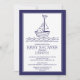 Invitation votre invité avec notre invitation de baby shower nautique garçons contemporains avec un voilier avec un petit oiseau et poka des voiles et des vagues sur un arrière - plan blanc avec un cadre bleu marine Retournez notre baby shower garçon moderne et élégant invitation sur pour voir un dos bleu assorti!