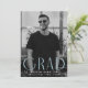 Célébrez la journée spéciale du diplômé avec ces invitations modernes et élégantes à la remise des diplômes avec la photo verticale du diplômé et "Grad" en bleu clair, lettres art déco. Personnalisez le front avec le nom du diplômé, l'école et l'année de remise des diplômes pour une touche unique et mémorable. L'arrière de l'invitation présente des détails de fête contre un arrière - plan tourbillon géométrique bleu ciel et blanc, ajoutant une atmosphère amusante et contemporaine. Parfaits pour les diplômés du secondaire et du collège, ces invitations simples mais élégants sont sûrs d'impressionner vos invités et de donner le ton pour une célébration fantastique.