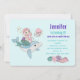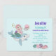 Une invitation à une fête d'anniversaire avec une illustration adorable. Conçue avec une jolie fille sirène chevauchant un dauphin heureux. Un petit ami méduse les accompagne. Décoré de petites éclaboussures de paillettes dorées fausses.