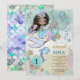 Les petites filles adorent les choses magiques. Cette invitation magique pour un premier anniversaire sous la mer avec une sirène et un dauphin ravira les invités avec une touche fantaisiste, représentant une sirène, un dauphin, une tortue et des coquillages, dans de jolies couleurs rose, bleu-vert et lilas pâle. Des écailles de queue de sirène au dos de l'invitation. Un monde sous-marin de magie et de mystère.