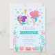 Cette invitation d'anniversaire mignonne et capricieuse présente d'adorables sirènes avec des cornes de licorne dans un ton de peau moyen. Dans l'arrière - plan est un hippocampe, crabe, coquillages, étoiles de mer, corail, algues, bulles et sable. Le texte combine les polices décoratives et serif pour un look élégant et moderne. C'est parfait pour une fête d'anniversaire sur le thème de la sirène ou de la sous-marine.