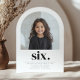 Une simple invitation à l'anniversaire de 6ème anniversaire avec votre propre photo en forme d'arc et les mots "six" en dessous. Vous pouvez ajouter votre propre photo rapidement et facilement dans ce design.