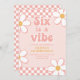 Six est une Vibe Super Girl Retro inspiré 6ème anniversaire invitation avec des polices de style années 70 et des marguerites et motif vérificateur.