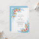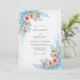 A vibrant watercolor design bursts with lively floral elements in shades of coral, pink, and peach. Delicate blue-green foliage weaves through the blooms, creating a romantic and cheerful ambiance. This design evokes a sense of joy and natural beauty for a special occasion.